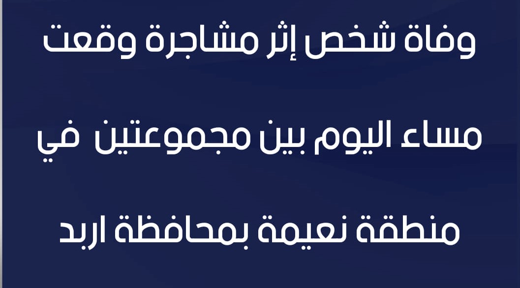 وقعت مشاجرة مساء اليوم بين مجموعتين في منطقة نعيمة بمحافظة اربد، نتج عنها وفاة شخص وإصابة أخر وتم نقل الوفاة وإسعاف الإصابة إلى المستشفى ووصفت الإصابة بالمتوسطة وعلى الفور توجهت القوة الأمنية للمكان وفتح تحقيق .