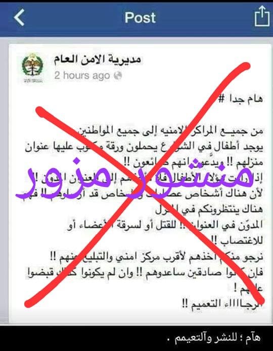 الأمن العام :نحذر من منشورات مزوّرة تحمل شعار المديرية وتدَّعي وجود عصابات تستخدم أطفالاً لاستدراج الضحايا