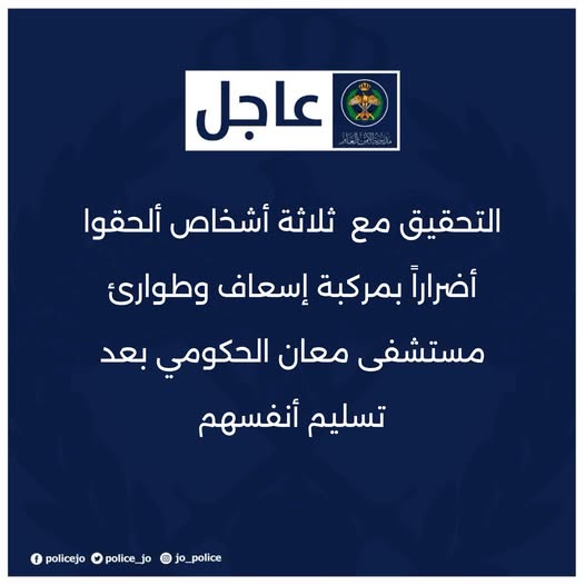 التحقيق مع ثلاثة أشخاص ألحقوا أضراراً بمركبة إسعاف وطوارئ مستشفى معان الحكومي بعد تسليم أنفسهم