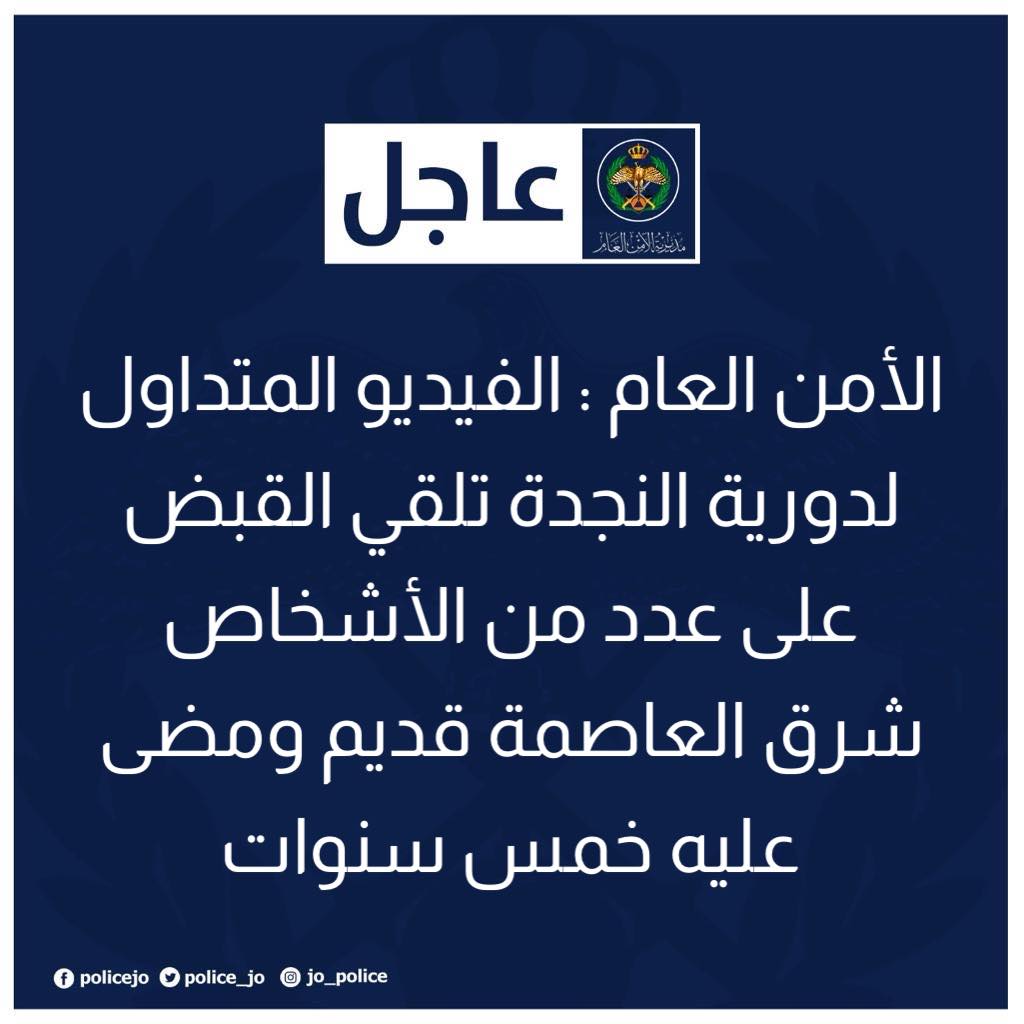 الأمن العام : الفيديو المتداول لدورية النجدة تلقي القبض على عدد من الأشخاص شرق العاصمة قديم ومضى عليه خمس سنوات