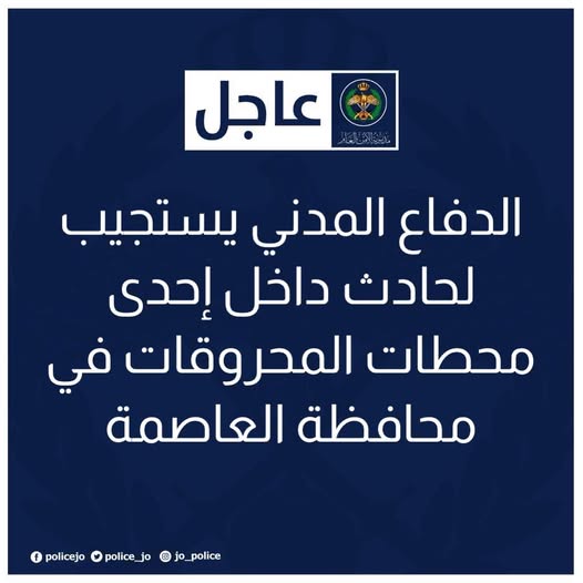 الدفاع المدني يستجيب لحادث داخل إحدى محطات المحروقات في محافظة العاصمة
