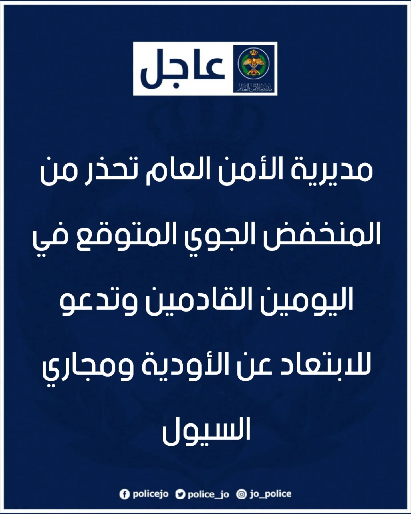 مديرية الأمن العام تحذر من المنخفض الجوي المتوقع في اليومين القادمين وتدعو للابتعاد عن الأودية ومجاري السيول