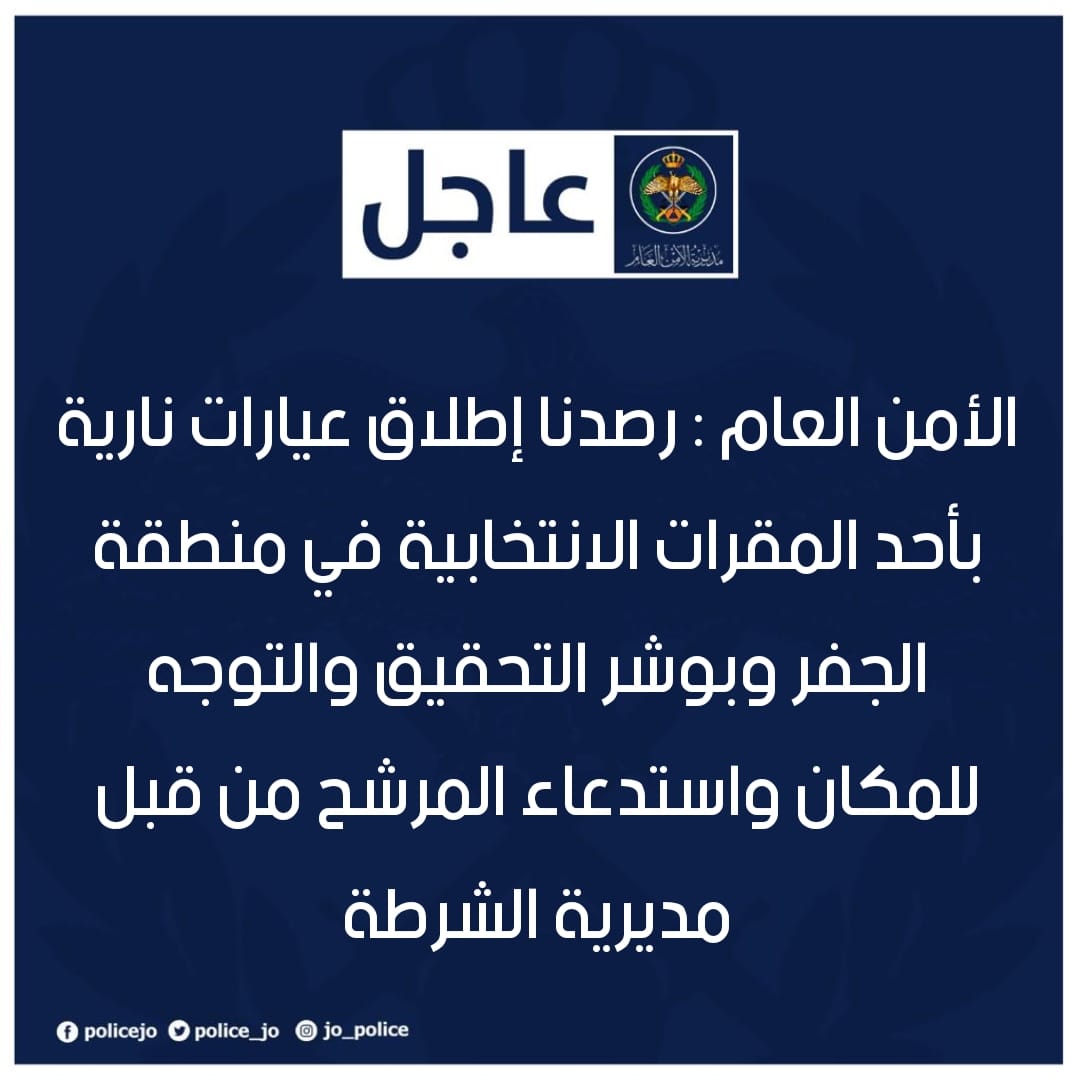 الأمن العام : رصدنا إطلاق عيارات نارية بأحد المقرّات الانتخابية في منطقة الجفر وبوشر التحقيق والتوجه للمكان واستدعاء المرشّح من قبل مديرية الشرطة