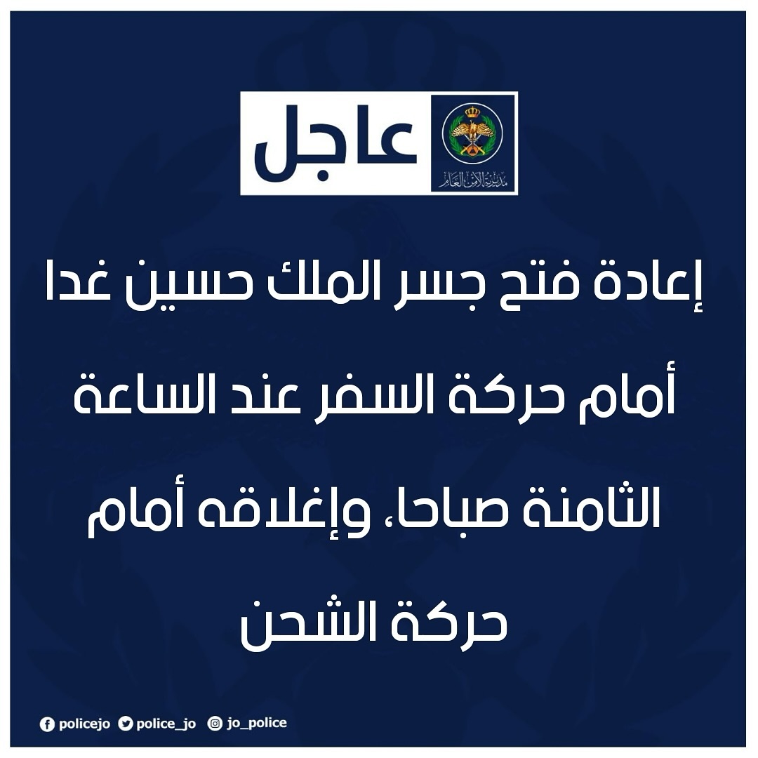 الأمن العام : إعادة فتح جسر الملك حسين غدا أمام حركة السفر عند الساعة الثامنة صباحا، وإغلاقه أمام حركة الشحن