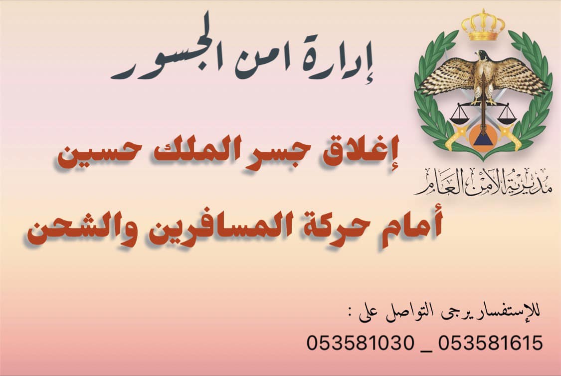 أعلن الناطق الإعلامي باسم مديرية الأمن العام عن إغلاق جسر الملك حسين أمام حركة السفر