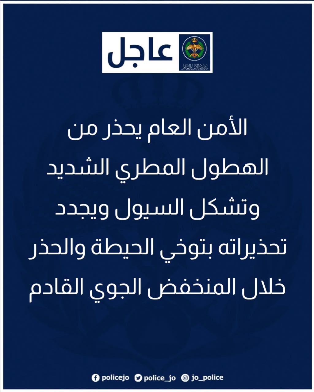 جددت مديرية الأمن العام تحذيراتها إلى المواطنين نتيجة الأحوال الجوية المتوقعة خلال الأيام المقبلة، وذلك نتيجة تأثر المملكة بمنخفض جوي مصحوب بأمطار ورياح شديدة قد يصحبها حدوث الرعد وتساقط حبات البرد