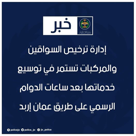 إدارة ترخيص السواقين والمركبات تستمر في توسيع خدماتها بعد ساعات الدوام الرسمي على طريق عمان إربد