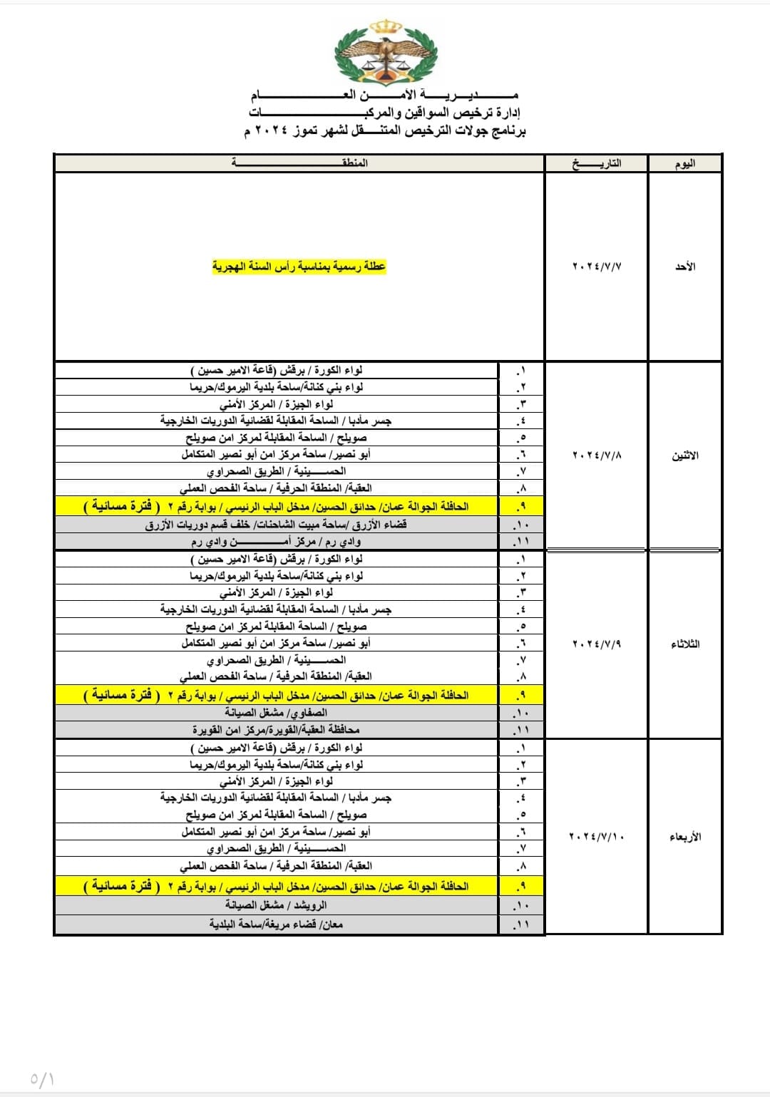 إدارة ترخيص السواقين والمركبات تعلن مواعيد العمل بجولات الترخيص المتنقل لشهر تموز لعام 2024م