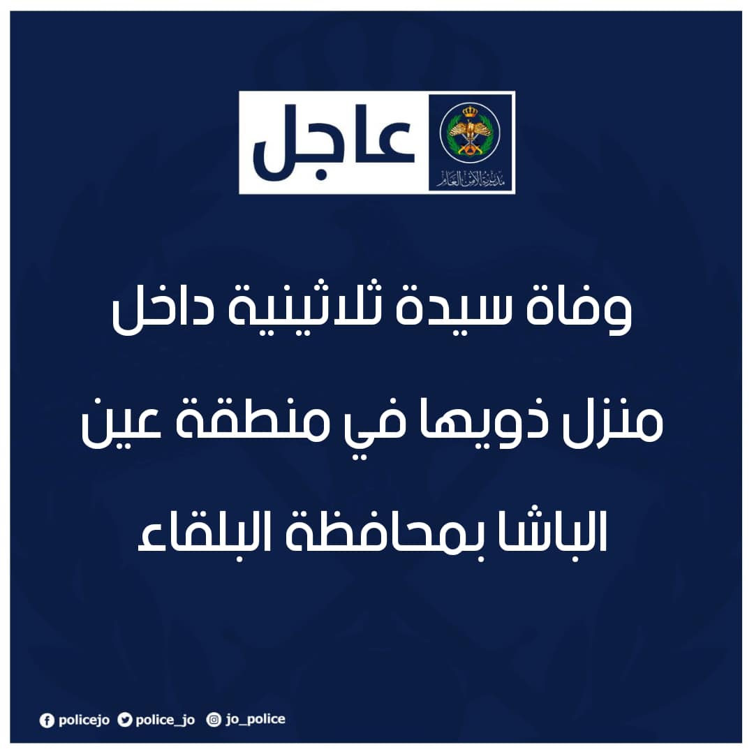 ورد بلاغ اليوم بوفاة سيّدة ثلاثينية داخل منزل ذويها في منطقة عين الباشا بمحافظة البلقاء، حيث تبيّن من خلال التحقيقات الأولية وجود علامات شدّة وعنف على جسدها