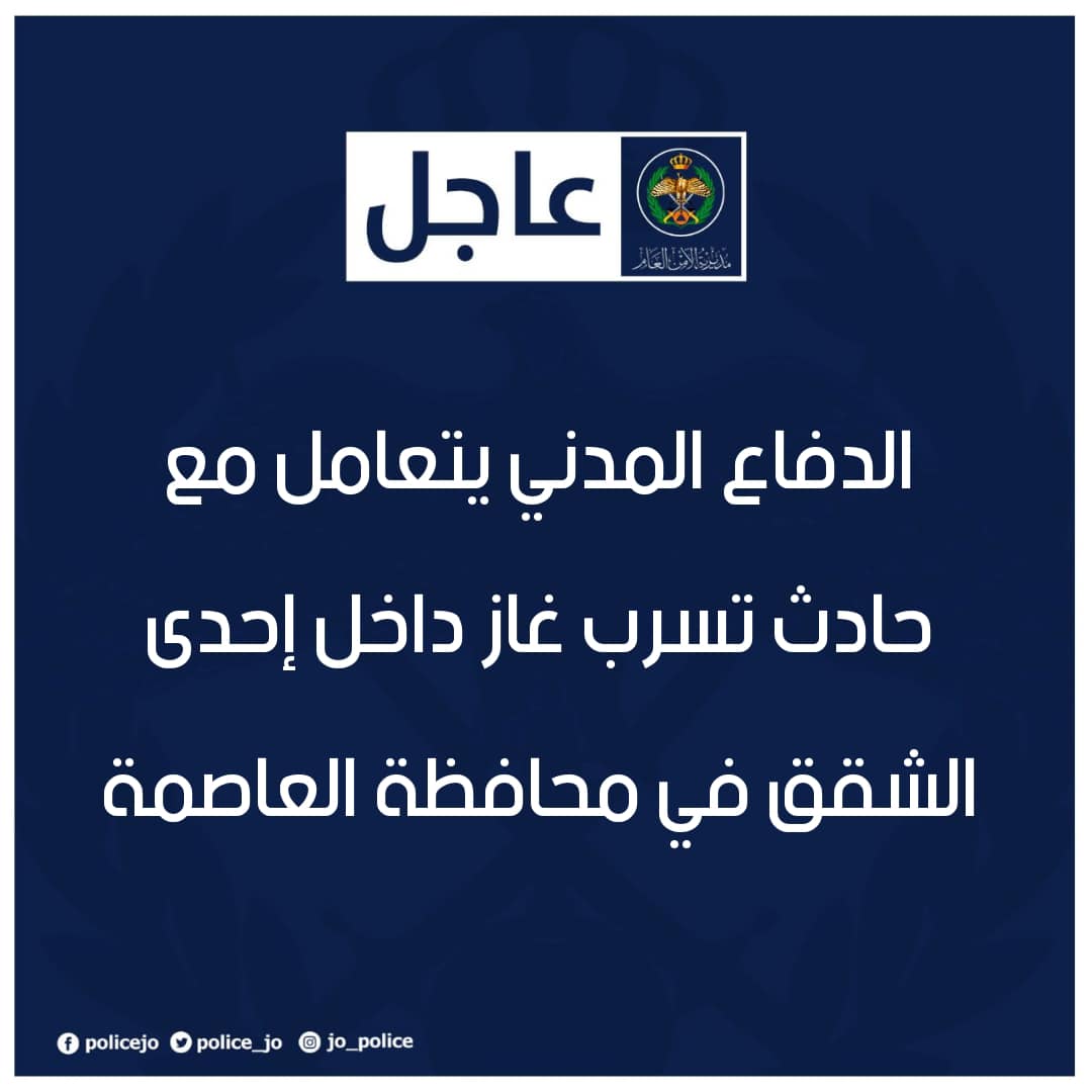 قال الناطق الإعلامي باسم مديرية الأمن العام أن فرق الإطفاء المتخصصة والعاملة في مديرية دفاع مدني شرق عمان استجابت لبلاغ يفيد بوجود تسرب غاز من اسطوانة الغاز المنزلية