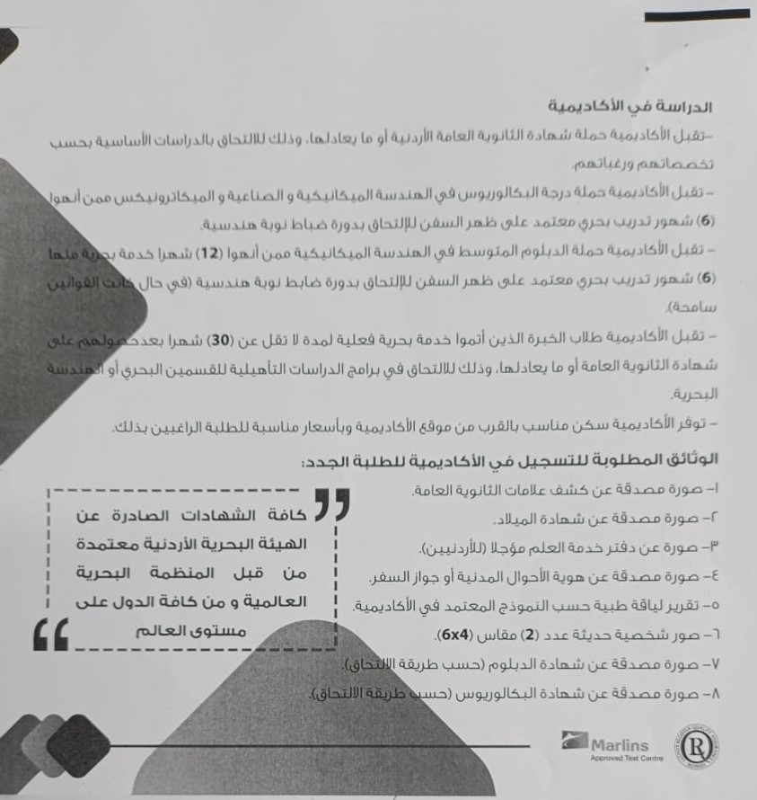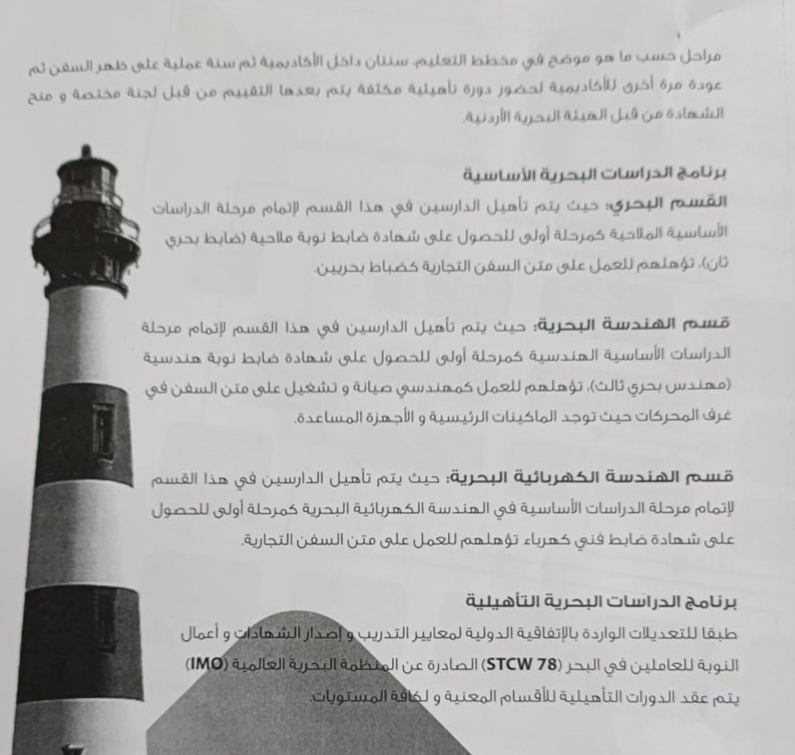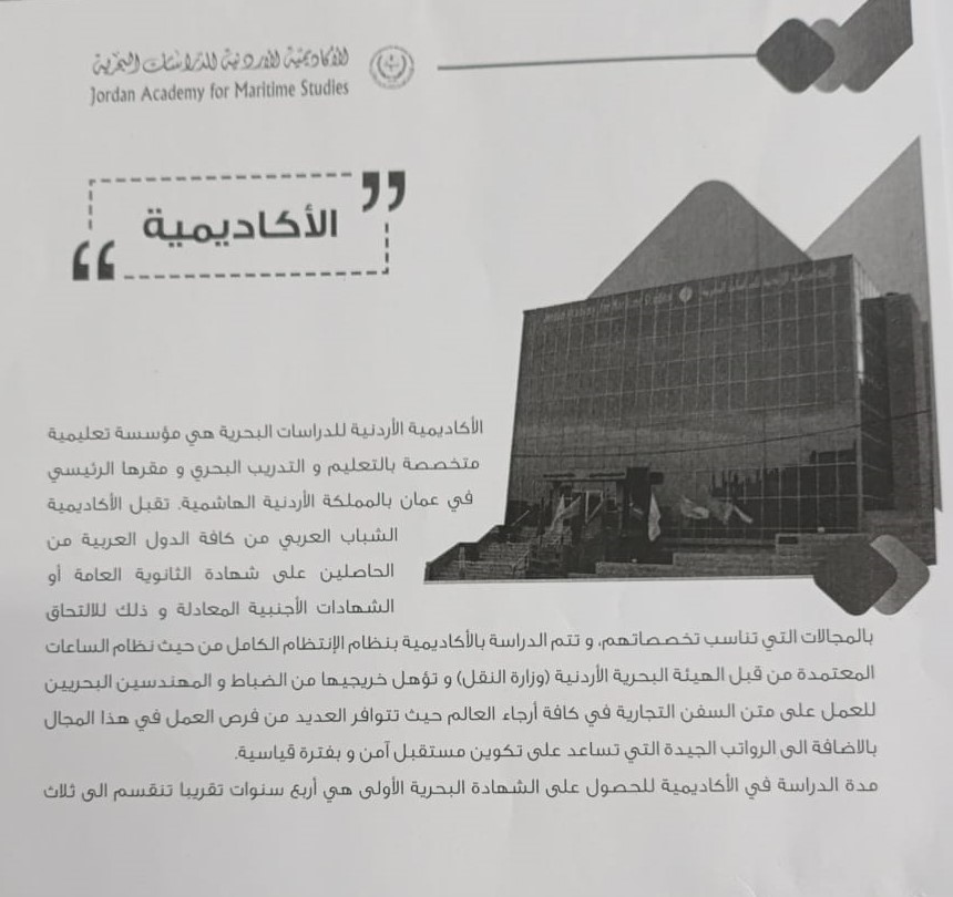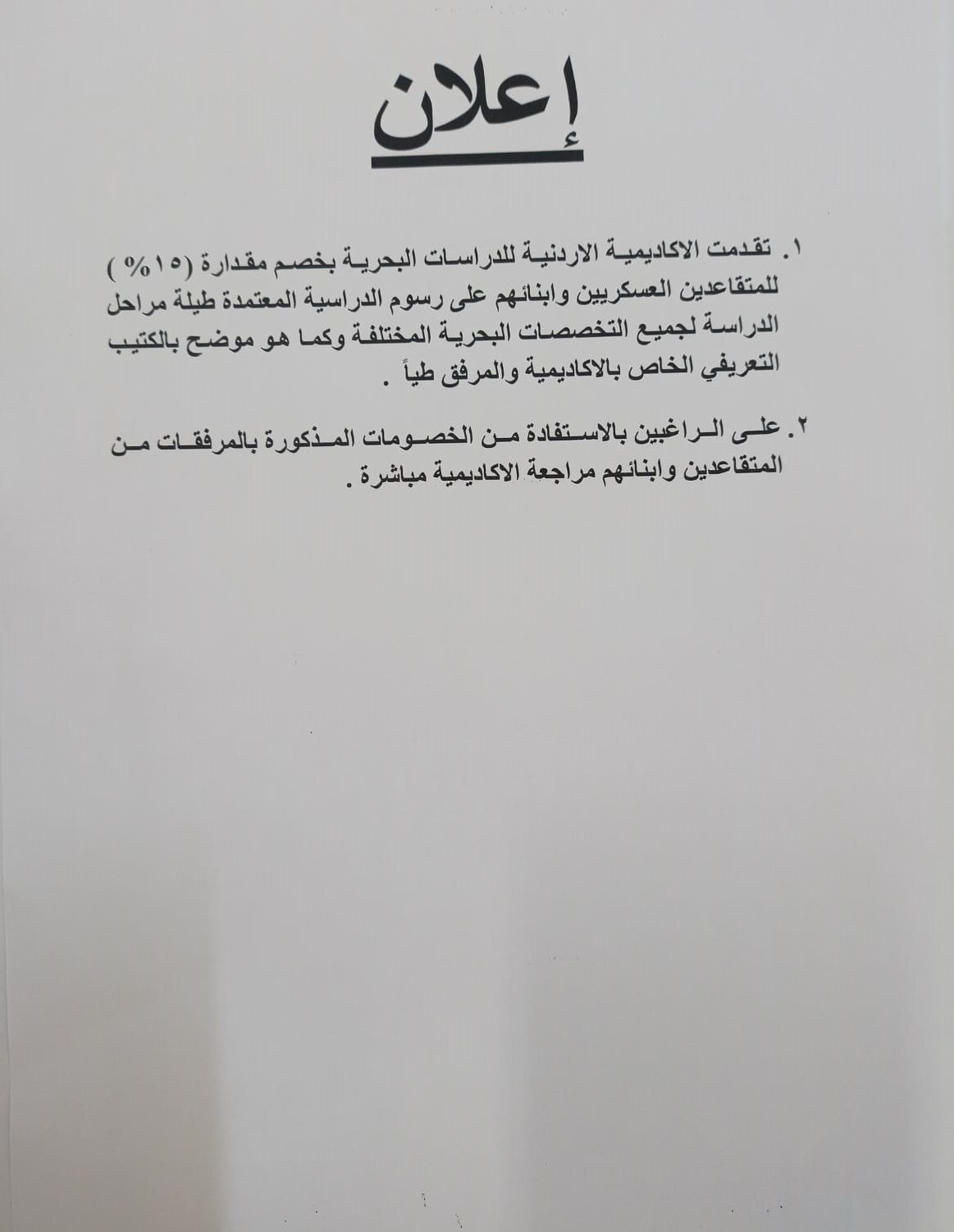 تقدمت الاكاديمية الاردنية للدراسات البحرية بخصم مقدارة ( ١٥% ) للمتقاعدين العسكريين وابنائهم على رسوم الدراسية المعتمدة طيلة مراحل الدراسة لجميع التخصصات البحرية المختلفة.
